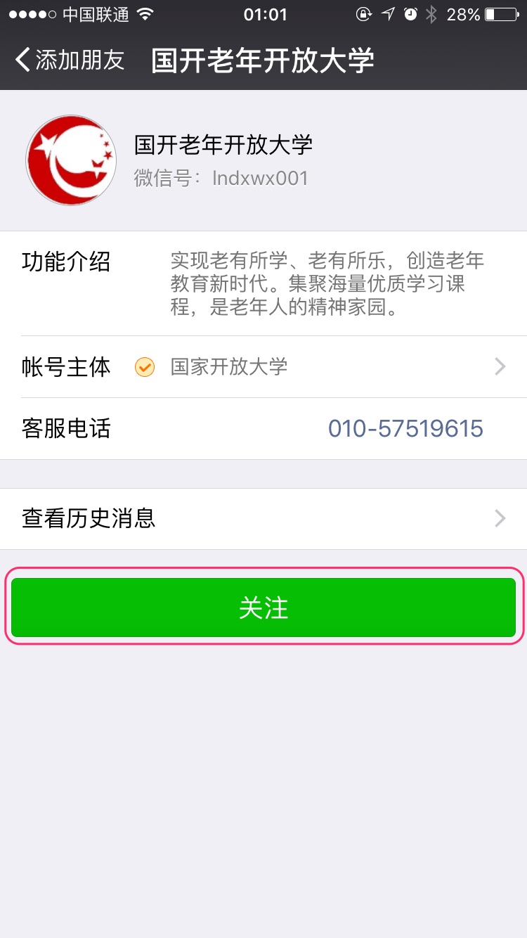 • 除了通过搜索添加公众号您还可通过扫二维码关注,扫码后将直接进入关注公众号步骤6