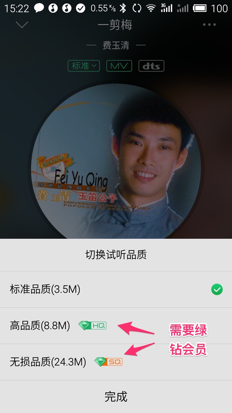 QQ音乐提供多种品质供您选择,品质越高播放越清晰文件也越大,不过QQ音乐的高品质音乐是一种收费服务,“高品质”和“无损品质”都需要开通QQ的绿钻会员才可使用,价格为每月10元,其实就试听而言“标准品质”也足够了
