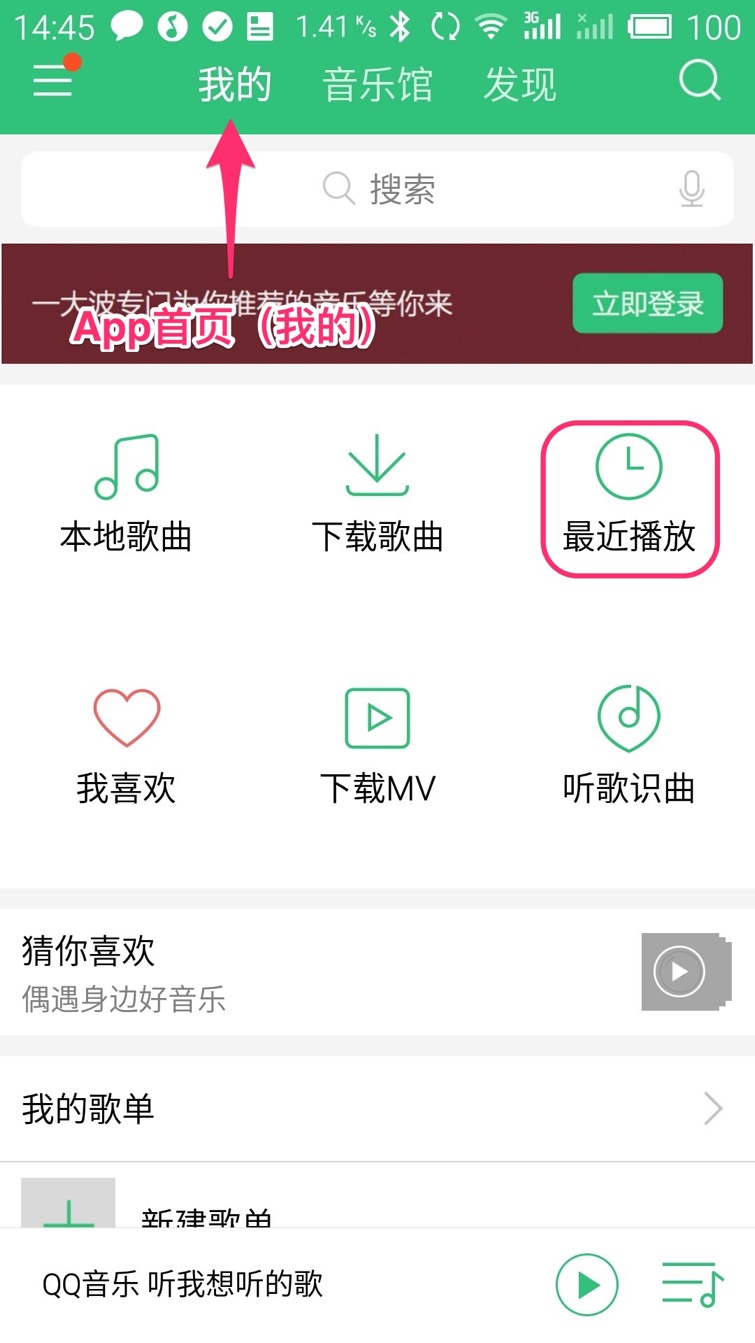 如果您知道要听音乐的名字可直接搜索,点屏幕上方的搜索框(红色线框内区域)或右上角的“放大镜”图标均可进入搜索界面