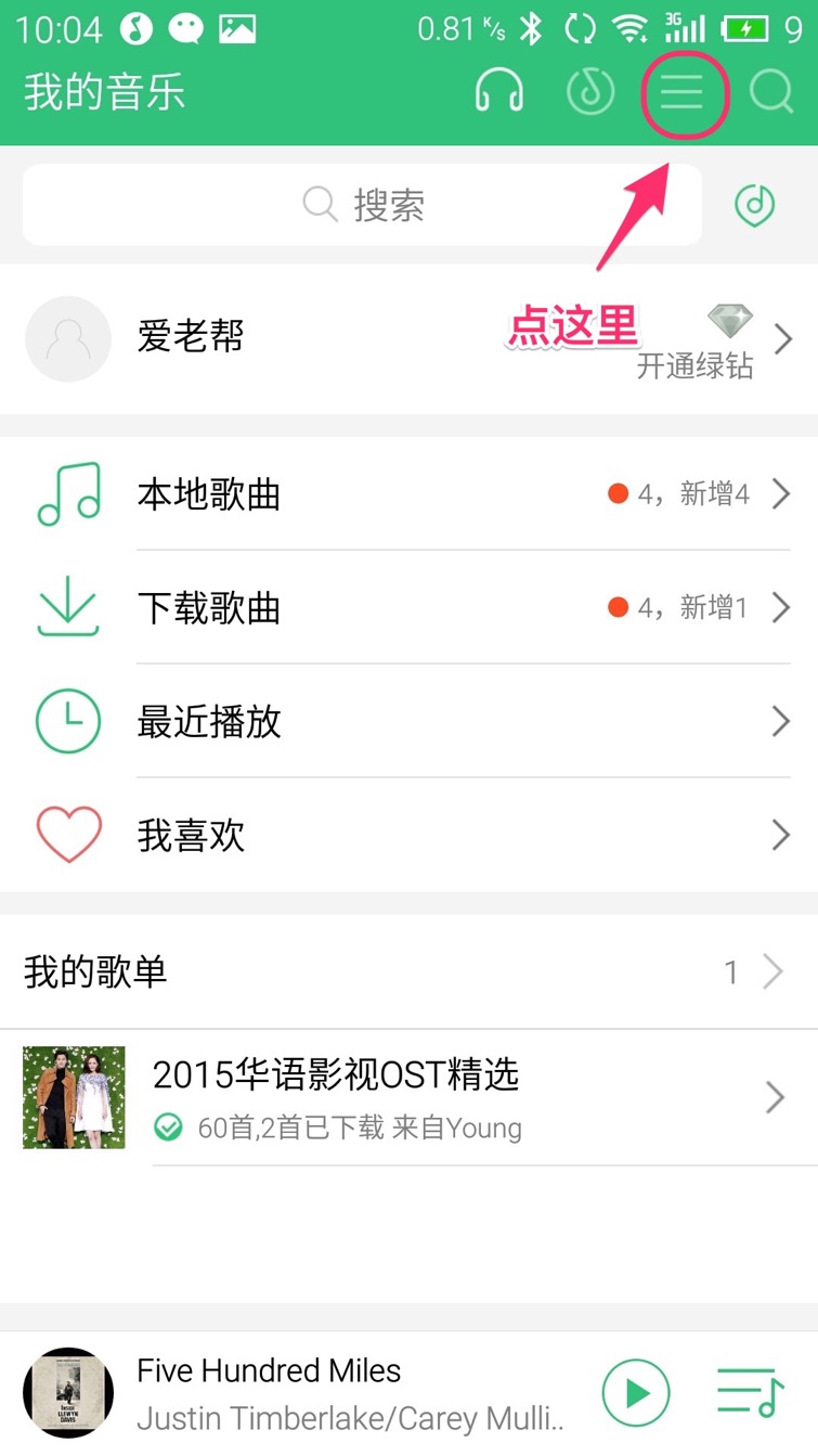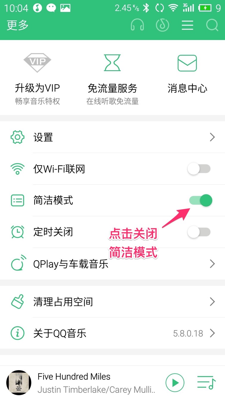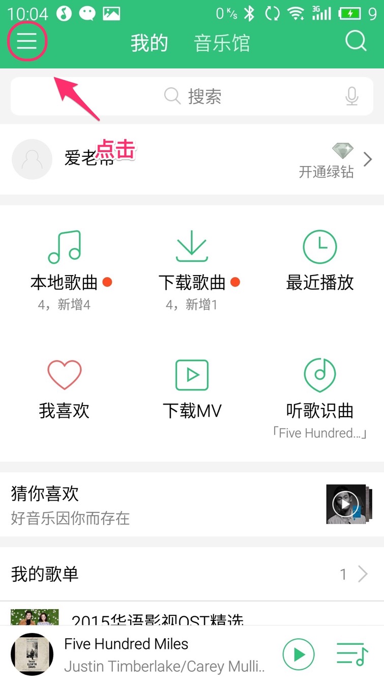 本步骤截图中的界面是QQ音乐的标准模式,现在介绍如何进入简洁模式。点击左上角的“三条横线”图标,进入QQ音乐更多界面