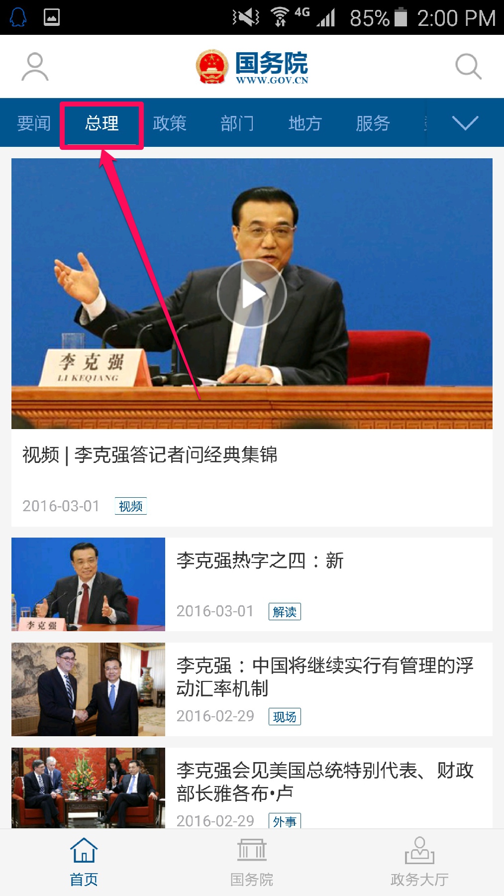 点击“总理”,可以查看关于李克强总理的重要出访、讲话、文件等