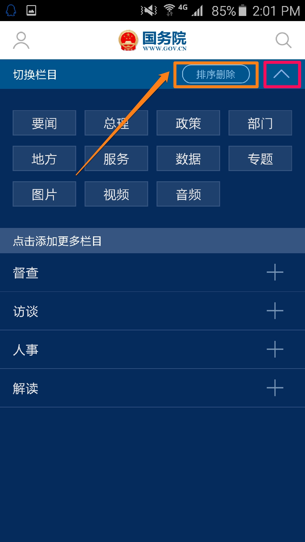 点击右上角的下箭头图标,进入栏目管理页面。在这里,点击“排序删除”,可以对首页的各子分类进行排序,或删除使其不出现在您的首页上