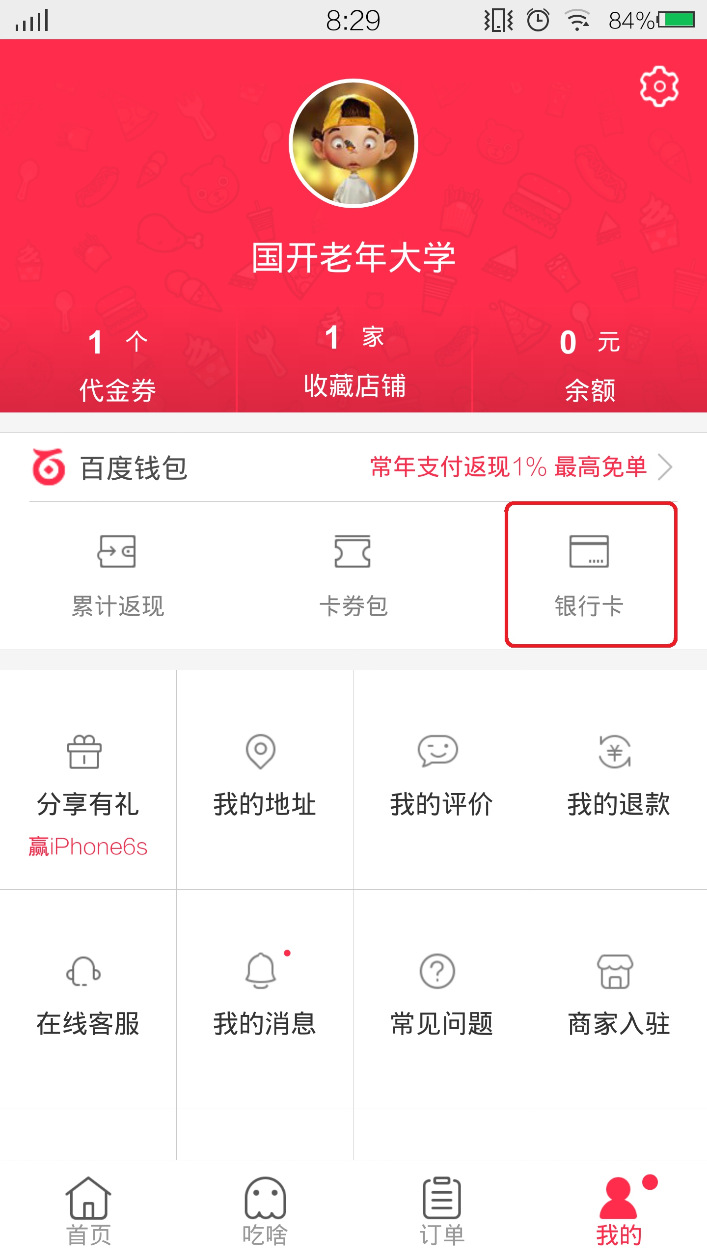 点击下方“我的”,进入管理界面,然后点击“银行卡”