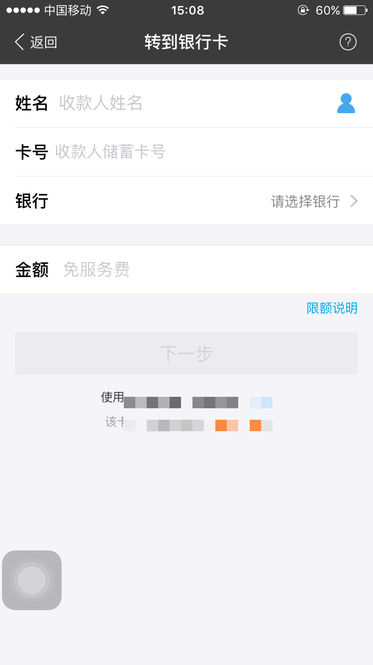 输入要转账金额,确认后点击“转账”。如果您有多张银行卡,可以点击蓝色小字,更换支付方式
