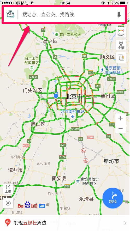 我们以从当前位置(五棵松)到公主坟为目的地进行路线查询,首先需要搜索要去往的目的地。如下图所示,在红框内搜索地点