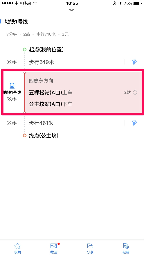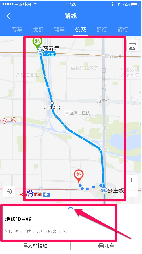 点击后会出现从当前位置到公主坟的交通路线推荐,上方为出行方式的选择,我们先选择“公交”的出行方式,乘地铁去往公主坟