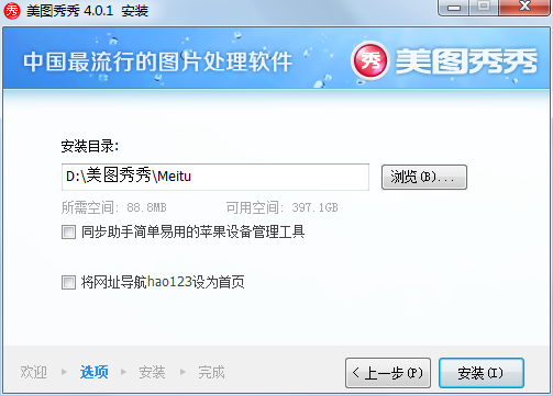 去掉所有需要勾选的辅助功能,将美图秀秀的安装目录设置在除C盘以外的盘符上,点击“安装”。