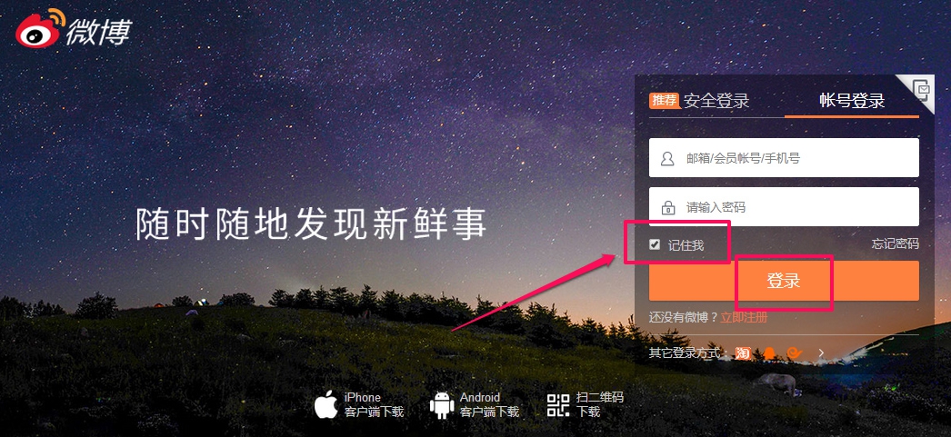 在电脑浏览器最上方的地址栏内,输入weibo.com,按下回车,跳转至微博登录页面。如果您已经注册了微博账号,请输入用户名、密码,并勾选“记住我”这个选项(下次在本电脑登录微博时不需要再输入用户名和密码了),然后点击“登录”