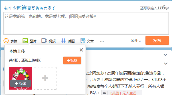 除了可以发布文字+图片的微博,您还可以单独发布图片微博或单独发布文字微博